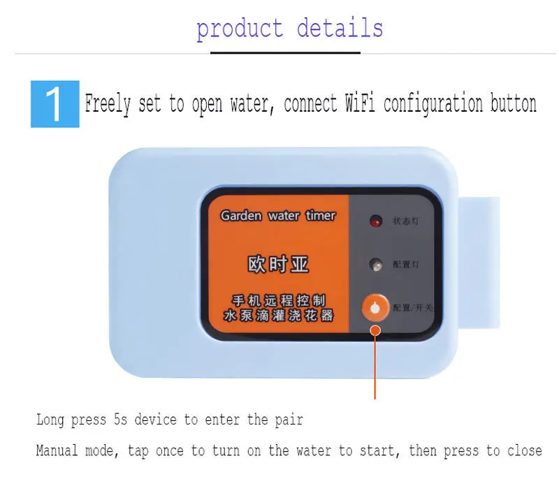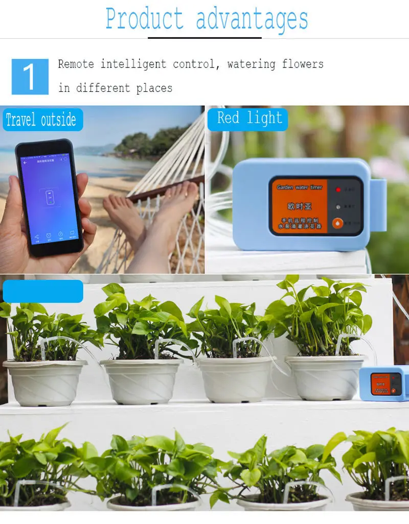 Мобильный телефон с дистанционным управлением Wi-Fi устройство полива интеллектуальная автоматическая система капельного орошения для сада растений водяной насос таймер Название продукта: мобильный телефон с пультом дистанционного управления водяным насосом Рабочее напряжение: 5V-9V Рабочий ток: более 1 А Настройки программы: Удаленное руководство, несколько наборов параметров программы орошения Применимые сцены: семейный сад, балкон, зеленые растения, настольные горшки и т. д. Информация о продукте Свободно установить, чтобы открыть воду, подключить WiFi кнопку конфигурации Нажмите 5s устройство, чтобы войти в пару Ручной режим, нажмите один раз, чтобы включить воду, чтобы начать, а затем нажмите, чтобы закрыть Светодиодный светильник красного цвета: красный светильник указывает, что раздвижная дверь открыта, а тушение указывает на то, что клапан закрыт. Светильник конфигурации синий: Нормальный рабочий сетевой синий светильник всегда включен. Если синий светильник медленно мигает, это означает, что нет подключения к Интернету. Если синий светильник быстро мигает, это означает, что он соответствует Интернету. Покупка содержит Наборы для полива: 1 * водяной насос, 15 * Тройник, 10 м * шланг, 15 * капельная стрела, 1 * фильтр, 1 * USB кабель, | ||||||||