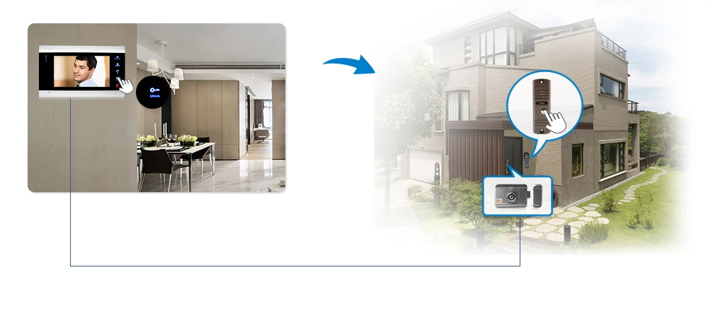 Поддержка подключения к этой системе функции задержки электронный замок. С этой функцией вам просто нужно нажать кнопку разблокировки на мониторе. Поддержка регулировки времени между блокировкой и разблокировкой.