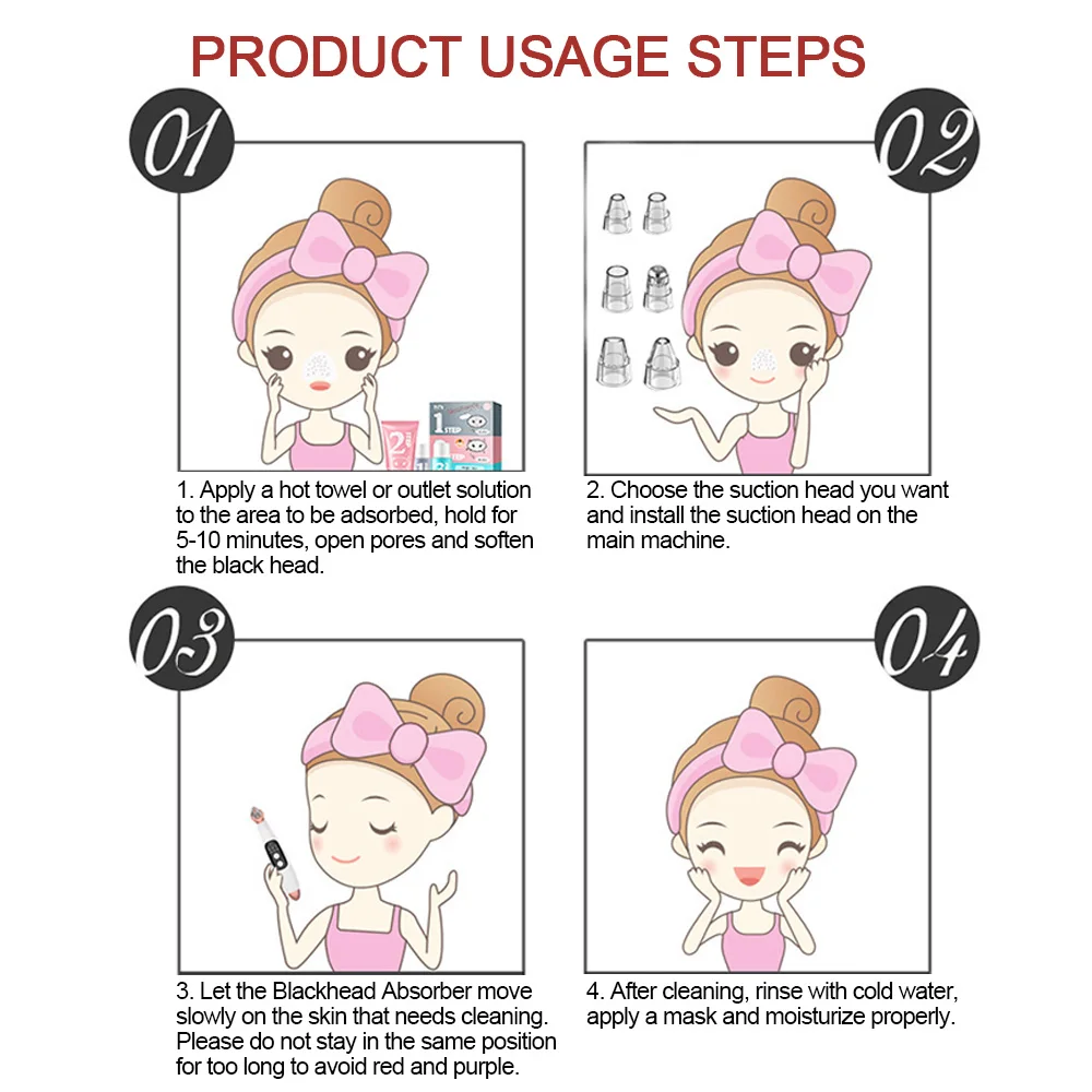 Три режима имеют три различных всасывания, Третий режим соответствует жирной коже, второй режим соответствует нейтральной коже, и режим один соответствует сухой коже. Избегайте длительного всасывания на коже и повреждения кожи.