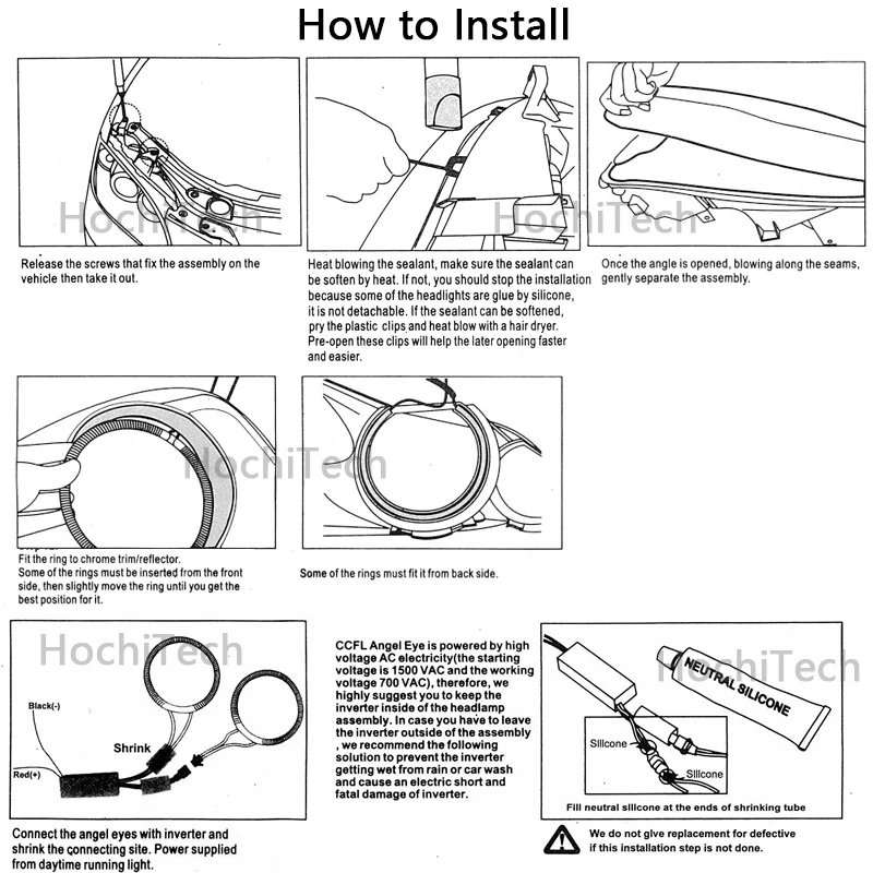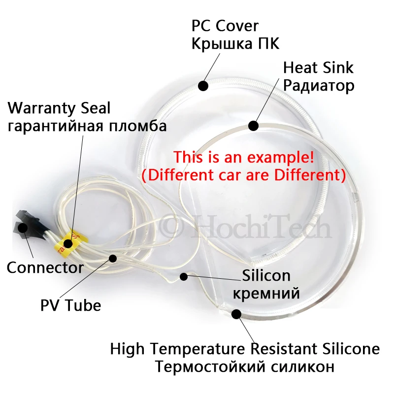 О: любой человек, имеющий некоторый технический опыт, базовое понимание электрических цепей может установить и HochiTech Halo Kit. Мы также предлагаем профессиональную установку и предварительно установленные фары (электронная почта для получения подробной информации).